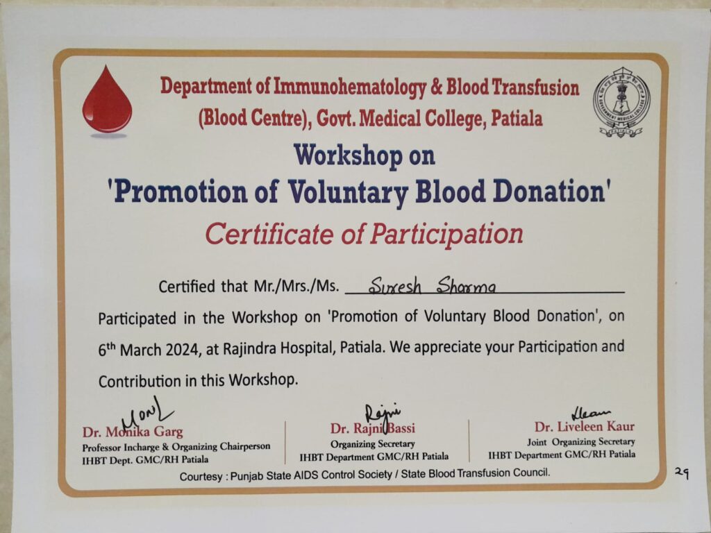 Participation in workshop on "Promotion of Voluntary Blood Donation"